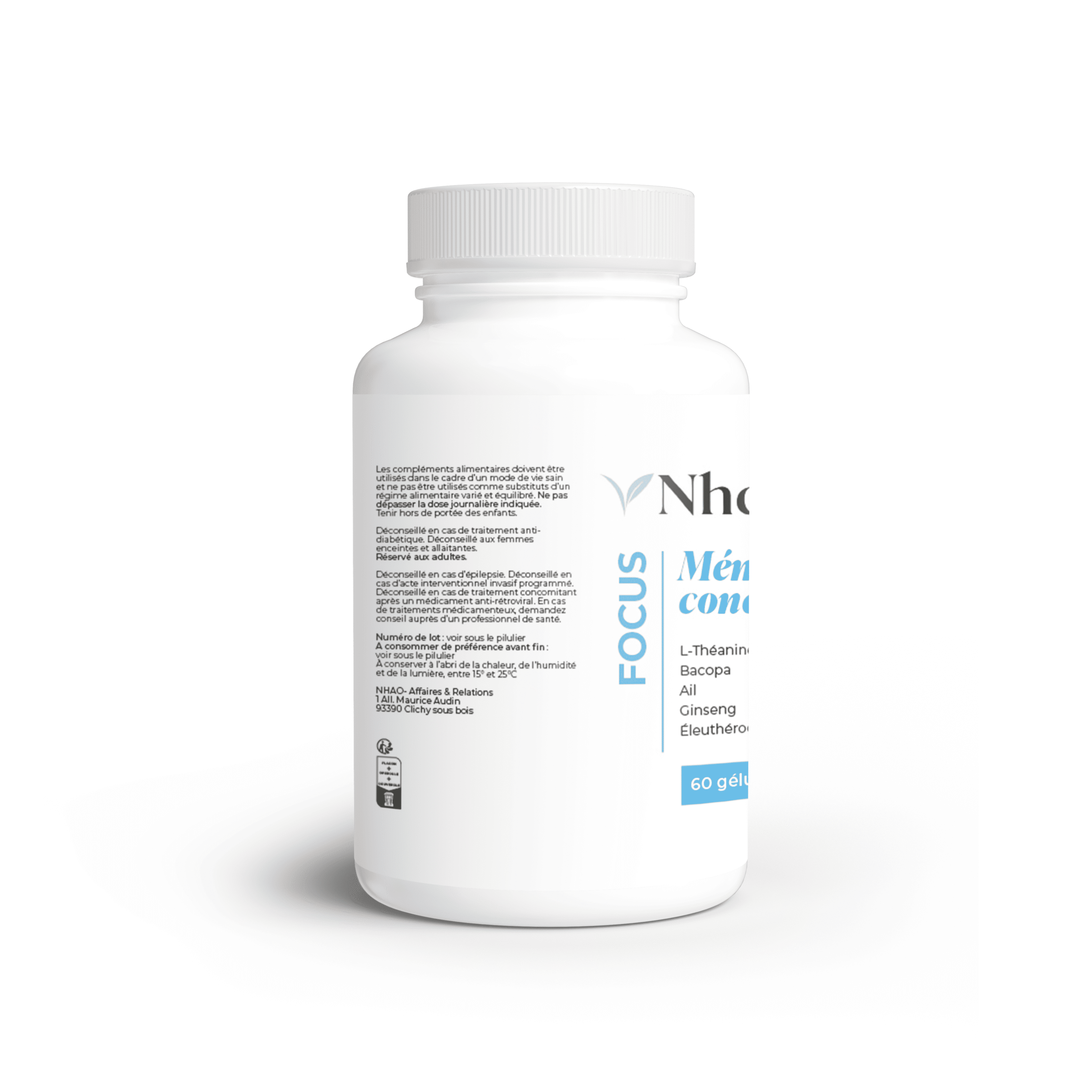 Complément alimentaire à base d’extraits de plantes : L-théanine, Bacopa, Ginseng, Ginkgo biloba, Ail, et Eleuthérocoque. Contribue à soutenir la mémoire, la concentration et la résistance au stress passager.